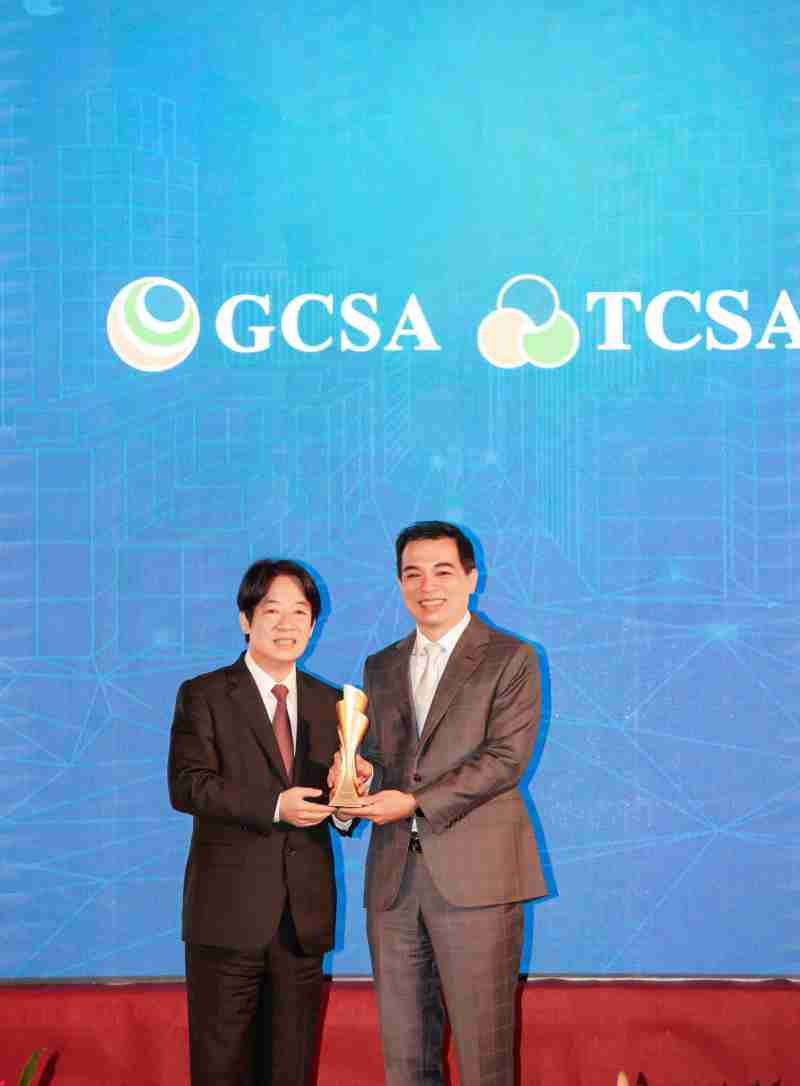 达全方位永续表现获全球永续奖及台湾永续奖肯定,,,,由副总统赖清德颁奖 (左),,,彩霸王总经理柯富仁 (右) 代表领奖
