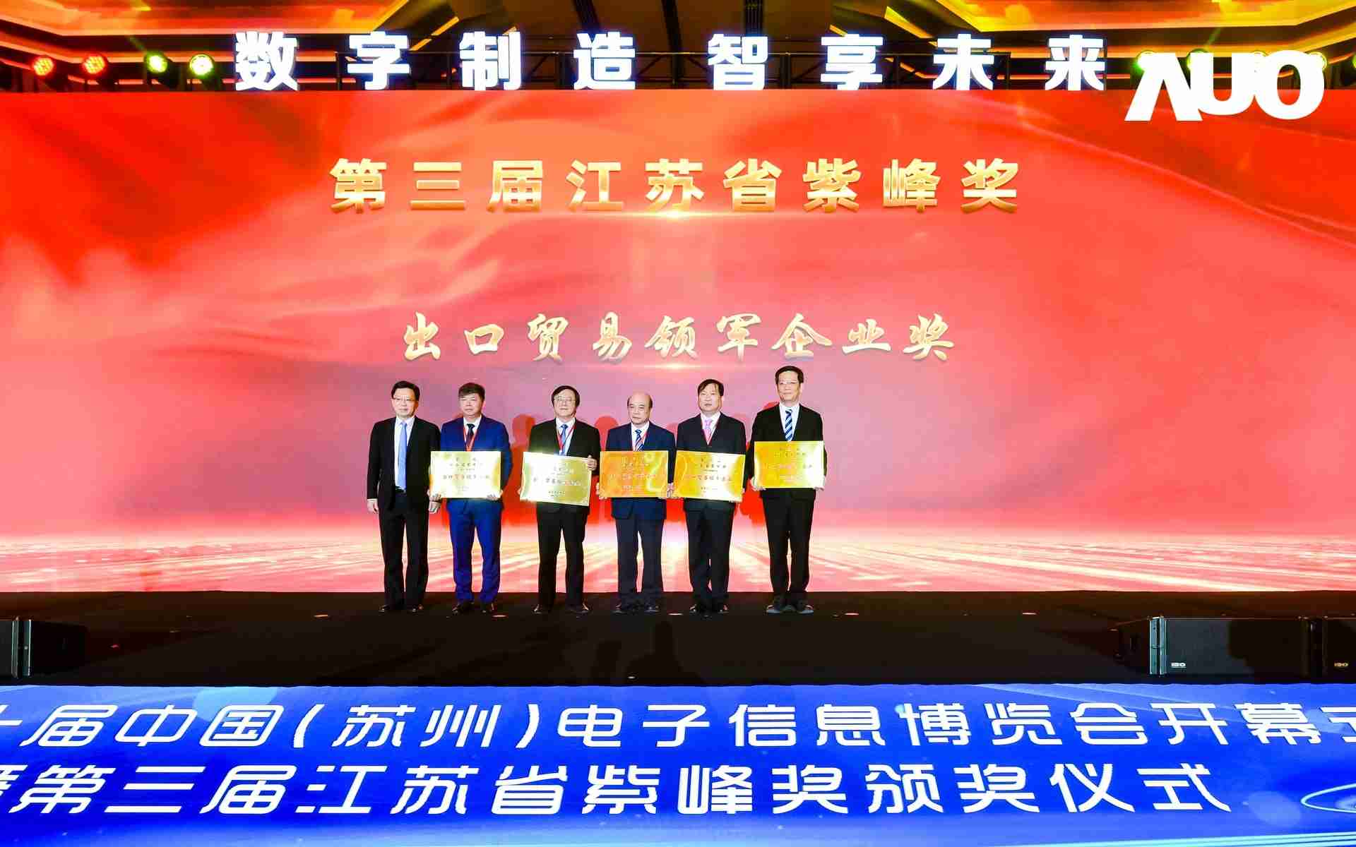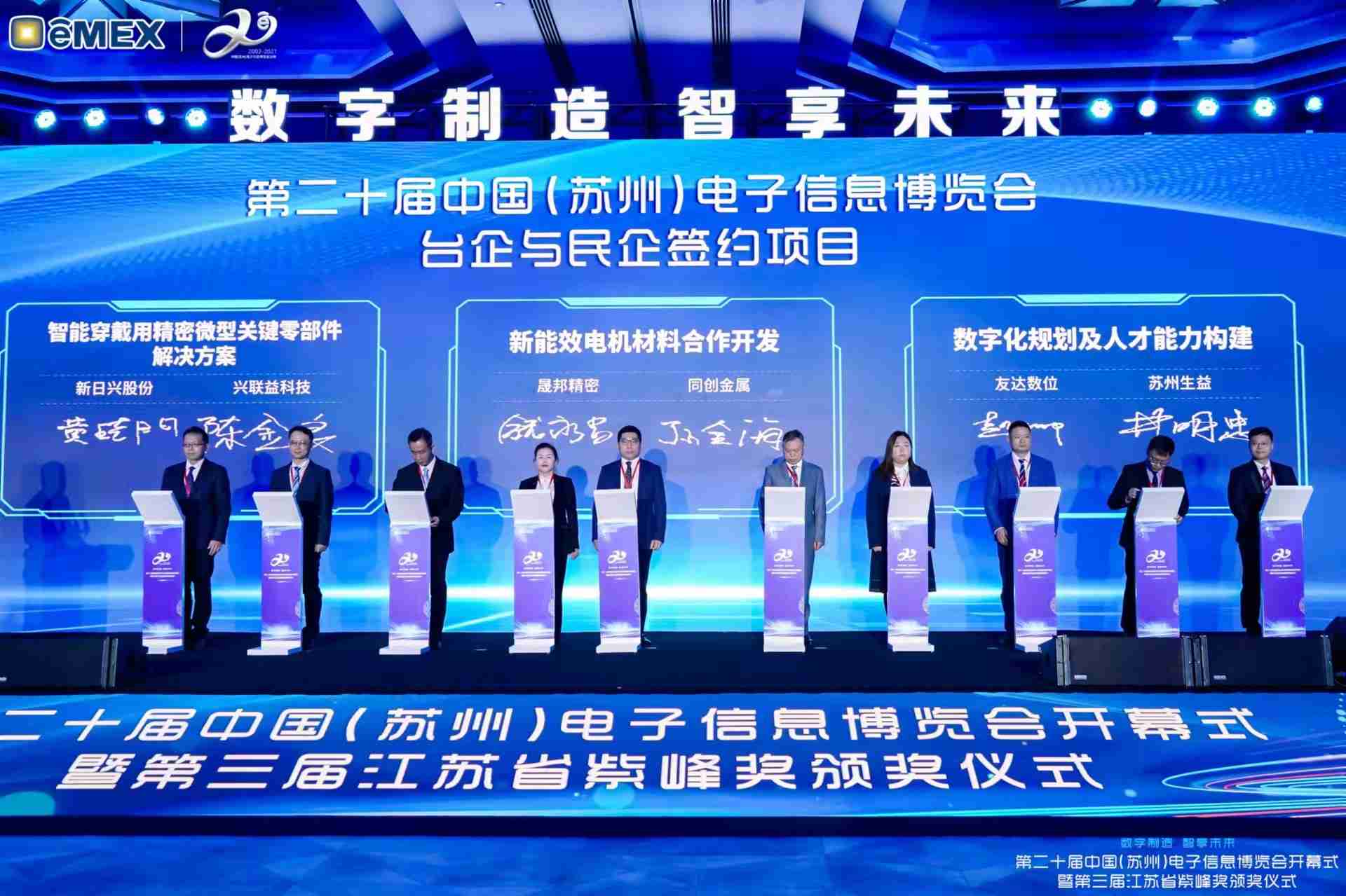 电博会开幕式当天也是第三届江苏省紫峰奖颁奖仪式,,省台办、、工信厅、、、商务厅、、苏州市相关领导均出席并颁奖。。。。该奖项为表彰对江苏高质量发展做出积极贡献的在苏企业,,由江苏省政府专门设立。。。彩霸王光电 (苏州) 总经理郭振明代表上台领奖,,这也是彩霸王苏州连续三次蝉联紫峰奖 出口贸易领军企业奖。。彩霸王数位总经理赵丽娜女士,,,也参与本次开幕式,,,,上台为本地化赋能签署战略合作协议,,,,将优质服务资源集合、、、、下沉到更多细分行业,,,,为更多地区的制造企业提供数字化转型服务。。。
